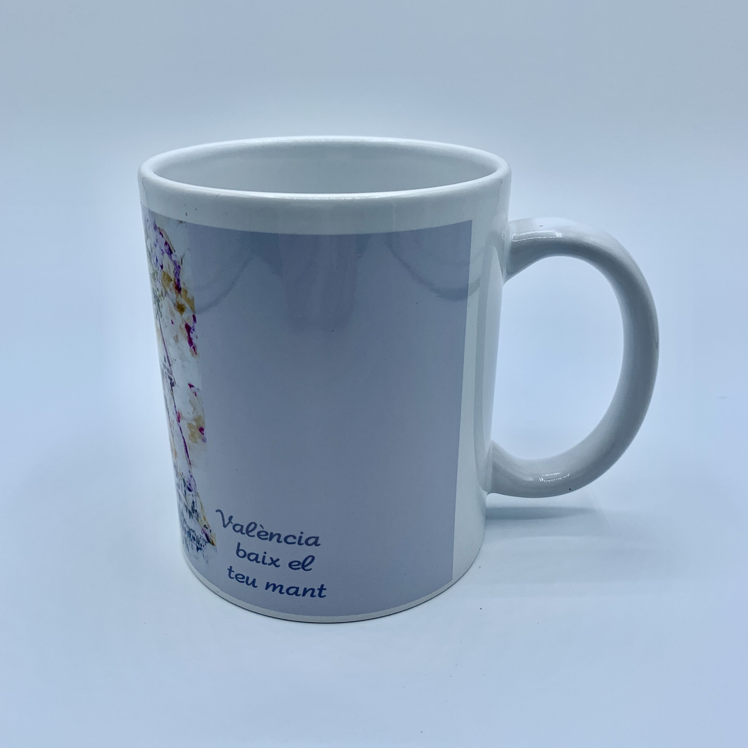 Taza de cerámica de 350ml de capacidad en color blanco con el diseño de la Virgen de los Desamparados. Presentada en caja individual.